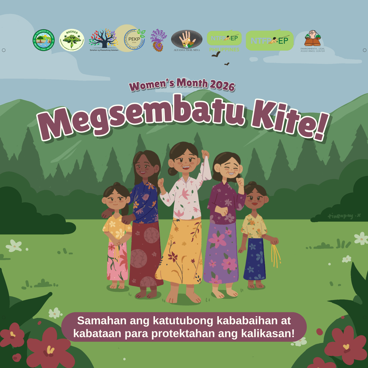This artwork was used in the 2026 Community Women's Day in Brooke's Point, Palawan. It features Palaw'an women and youth in their beautiful and bountiful ancestral domain. Megsembatu Kite or magsama-sama tayo, encourages the Palaw'an community to be united in their calls for the protection of the environment.